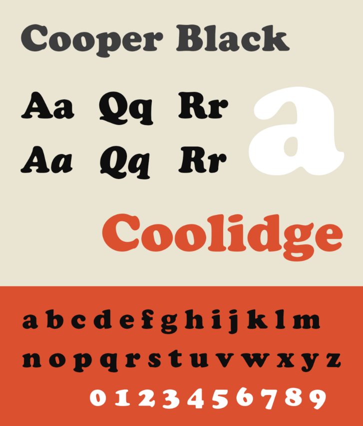 Cooper Black is a classic serif font with rounded, bold letterforms. Widely used in vintage posters, album covers, and nostalgic branding.